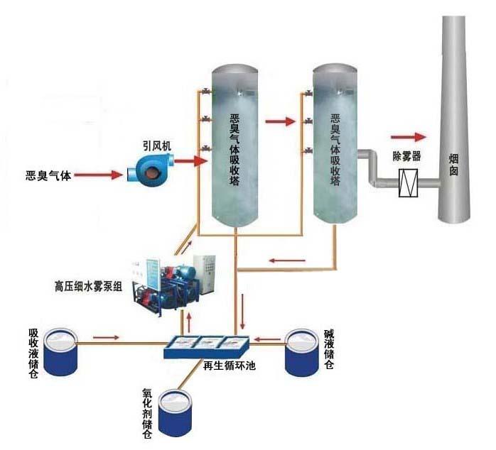 The malodorous gases are collected with collection cap and enter into high-pressure water mist absorptiontower 1 through the induced draft fan for odor removal. Several layers of high-pressure water mist combined spray heads are placed in the tower. The absorption solution with certain concentration is pumped into the combined spray heads, forming high-pressure water mist which will be sprayed out and contact with the malodorous gases sufficiently. The super-fine dust in the malodorous gases is moistened and agglomerated into large granule which will fall under its own gravity action and flows into the ash water tank. The ammonia gas and hydrogen chloride of the malodorous gases fully contact and react with the water mist formed by the absorption solution to produce the corresponding salt which will fall and flows into the ash water tank. After the solution is clarificated, add sodium hydroxide into it to increase its PH value. Then filter the solution and make it flow into the clear solution tank. Add oxidant (sodium hypochlorite) into the clear solution tank. After that the solution will be filtered and for cyclic utilization by the high pressure pump set. The small quantity of malodorous gases like hydrogen sulphide, mercaptan and dimethyl sulphide, if encountering the high-pressure water mist sprayed in the form of counter-flow in the absorption tower 2, will be absorbed and oxidized into clear gas without odor. The purified gas reaching emission standard provision will be discharged from the chimney after its water of supersaturation deprived.