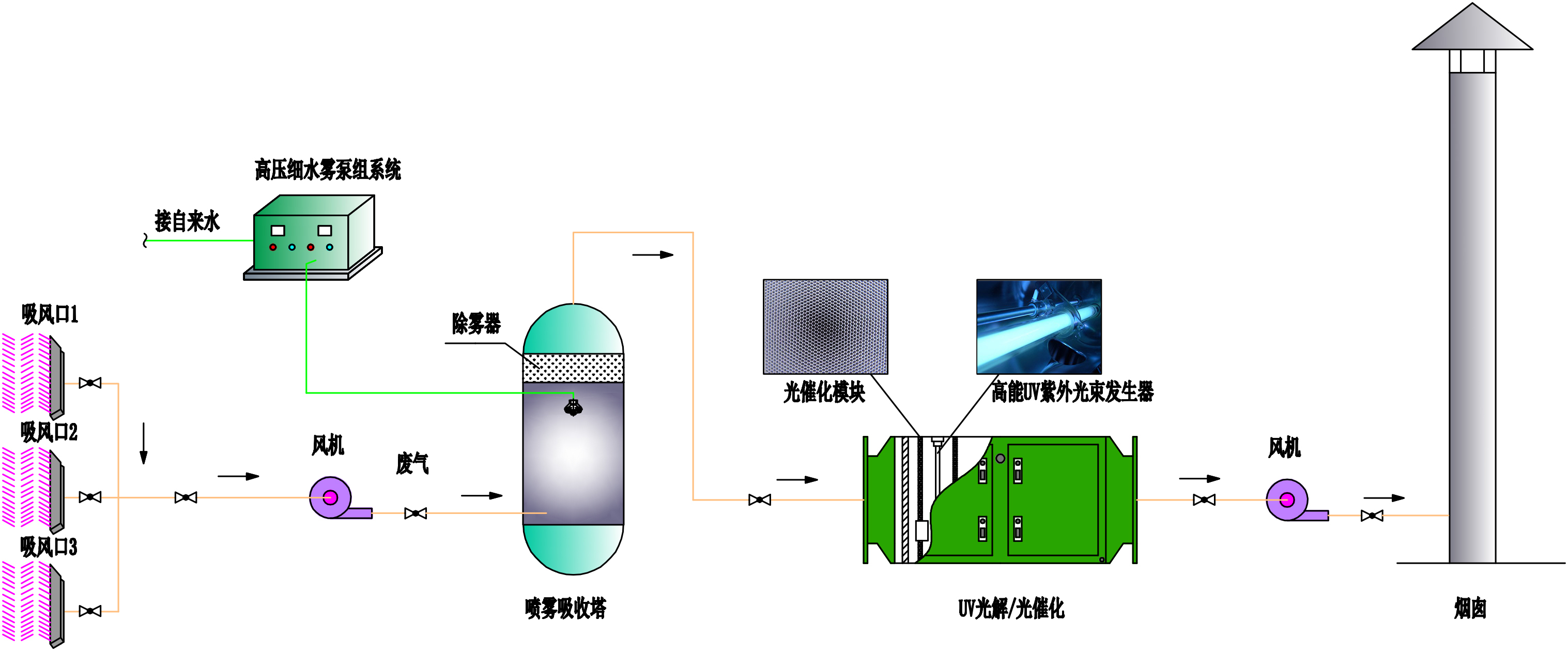 海力特治理VOCs的核心工艺为“高压细水雾技术+UV光解/光催化”:①利用高压细水雾技术去除有机废气中的颗粒物以及能够溶于水的污染物;②利用高能UV紫外线光分解部分有机物,同时UV紫外线光分解空气中的氧分子能够产生臭氧,臭氧对有机物具有极强的氧化作用,使有机物质分解转化为低分子化合物、水和二氧化碳,达到净化有机物的目的。该工艺可使有机废气的治理效率达90%以上。