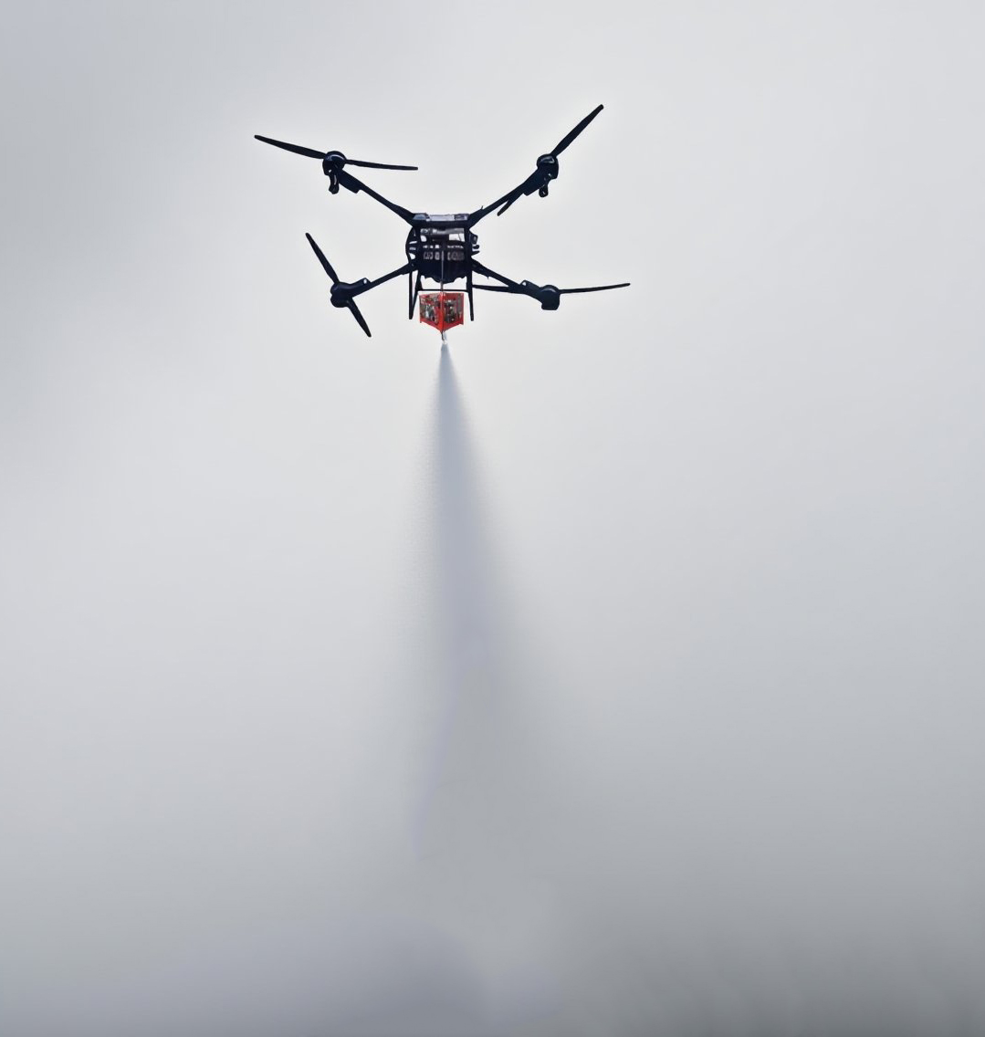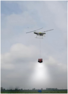 吊箱式细水雾灭火装置通过高强度绳索固定在无人机的架子上,其喷射方式主要是向下(大雾团),,具有机动、灵活等特点,可实现自动或遥控就近取水或更换吊箱从而实现长时间持续喷雾灭火。吊箱式不仅适用于城市消防灭火,还可用于林业火灾的扑灭、抑制等,可在水中添加阻燃剂,在火头前进的方向喷雾,形成防火隔离带;也可在水中添加其他药剂,实现森林植保的多功能作业。