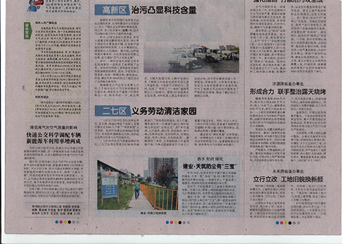 高新区充分利用辖区高新技术企业云集的优势,在传统覆盖防尘的基础上,引入了辖区企业研制的雾森系统、抑尘剂、高压细水雾车(如图)等,在大气污染治理工作中凸显科技含量。