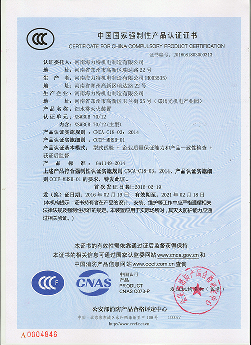 近期,海力特高压细水雾全系产品顺利通过国家3C强制性认证,海力特公司成为国内首批通过3C认证的厂家之一。