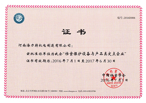 热烈祝贺河南海力特机电制造有限公司连续八年获得中国档案协会颁发的“档案保护设备与产品类定点企业”证书!为海力特品牌在档案行业的深入推广奠定了更加坚实的基础!