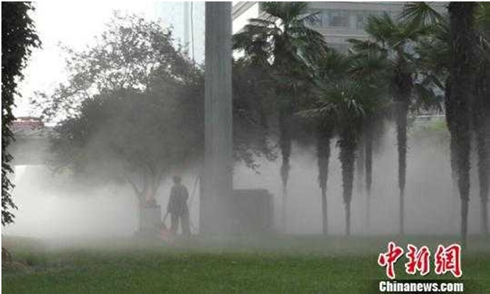 赵永帅告诉记者,水雾系统有几大优点,第一是喷雾效果,雾粒粒径比较细,降温效果比较好,蒸发速度比较快;第二个就是降尘,它粒径比较细,跟空气中扬尘比较接近,这样对空气中扬尘捕捉能力比较强,降尘效果比较明显,对PM2.5、PM10、臭氧都有一定吸附作用,包括汽车尾气颗粒物都有吸附作用;第三它可以将水撕裂,撕裂以后形成负氧离子,负氧离子对人体是比较有好处的;第四就是灌溉的功能,微喷灌溉,用水量比较少,比较节水;此外景观环境也是比较直观的一个功能。