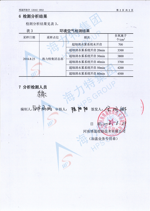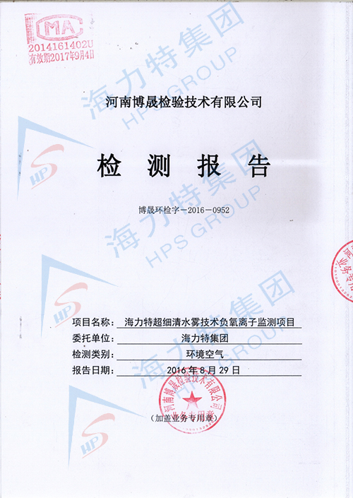 2016年8月29日,海力特超细清水雾系统由权威部门进行负氧离子检测,检测结果负氧离子高达4500个/cm3,远超空气负氧离子含量高级标准(大于2000),空气非常清新,对身体健康极有利,对人身体具有治疗和康复功效。