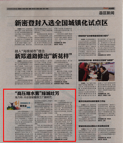 据了解,这种环境水雾技术叫做超细清水雾技术,是海力特公司独有的技术。海力特是国内集高压细水雾技术研发、生产、设计、施工及服务为一体的高新技术企业。它拥有200多项国家专利,被列入首批国家级知识产权优势企业范畴,在高压细水雾技术领域中是多项国家、行业标准的编写单位。该公司生产的高压细水雾技术产品,广泛应用于市政清洁、大气环保、消防灭火等领域。