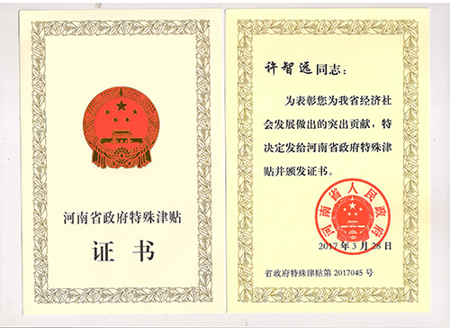 贺海力特集团董事长许智远同志获河南省政府特殊津贴专家称号
