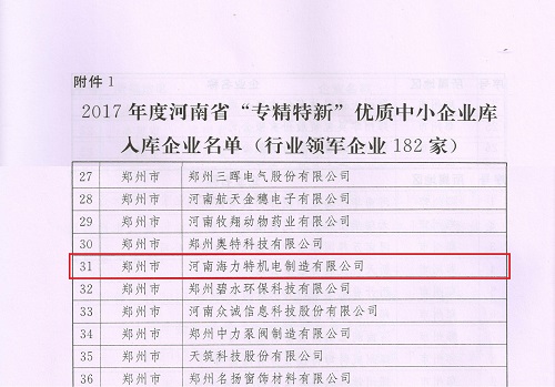 近日,海力特集团作为行业领军企业列入《 2017年河南省“专精特新”优质中小企业库入库企业名单》(豫工信企业【2017】264号)。