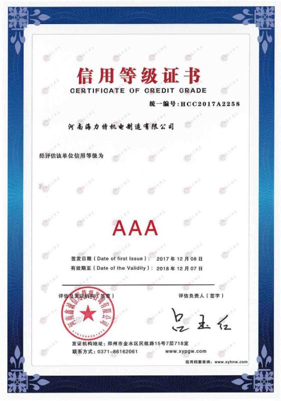 公司一直重视信用建设,秉承“诚信经营”的理念,重合同,守信用,坚持以诚立业、信誉取胜的原则,把诚信作为经营首要。海力特公司这次再获AAA级信用等级证书,代表着公司的“软实力”和信誉度的再次提升,也是对公司诚信经营行为的肯定,拥有AAA级资信,对公司的健康发展及公司在激烈的市场竞争中将打下坚实的基础。
