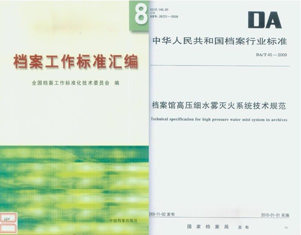 国家行业标准——《档案馆高压细水雾灭火系统技术规范》(DA/T45--2009)由中国国家档案局于2010年1月1日正式发布实施。
