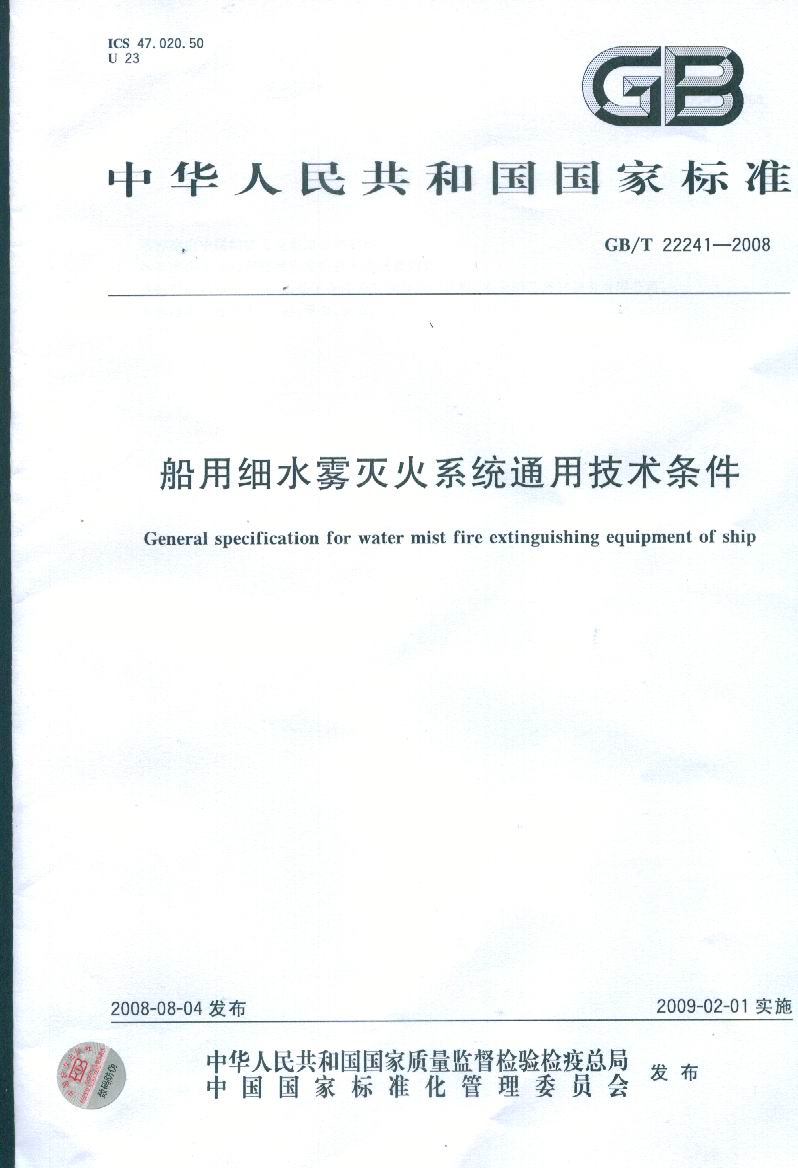 2009年2月1日,《船用细水雾灭火系统通用技术条件》(GD/T22241-2008)国家标准颁布实施,标准规定了船用细水雾灭火系统的分类、系统部件组成、要求、标志、包装、运输、贮存等,标准适用于系统部件的设计和生产,科学指导船舶消防的安全防护保障。