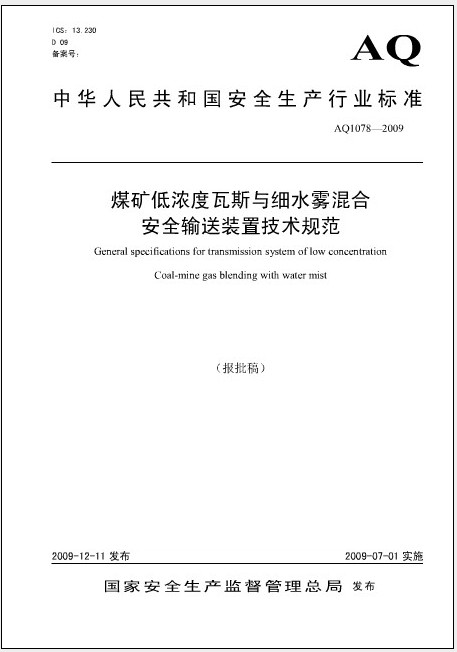 《煤矿低浓度瓦斯与细水雾混合安全输送装置技术规范》行业标准由国家安全生产监督管理总局发布,于2009年7月1日实施。 本标准规定了煤矿低浓度瓦斯与细水雾混合安全输送装置的设计、组件要求、控制、装置施工及验收。 本标准适用于煤矿低浓度瓦斯与细水雾混合安全输送装置的设计、施工、验收及运行。