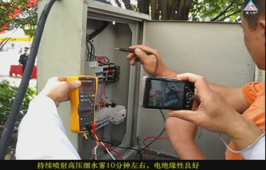 对通电工作状态下的变压器持续喷射高压细水雾10分钟左右,电绝缘性良好。