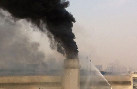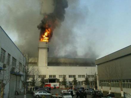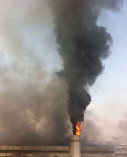 由于火势较大,下午3时15分许,失火车间外的一个烟囱里突然蹿出大火,有20米高。车间上空的浓烟也由刚开始的灰紫色,逐渐变成土黄色,后成为滚滚黑烟,周围的天空都被黑烟笼罩。消防人员动用一台高架水枪对准蹿火的烟囱口喷水,10分钟后,烟囱蹿出的大火被扑灭。下午4时20分,车间大火被彻底扑灭。