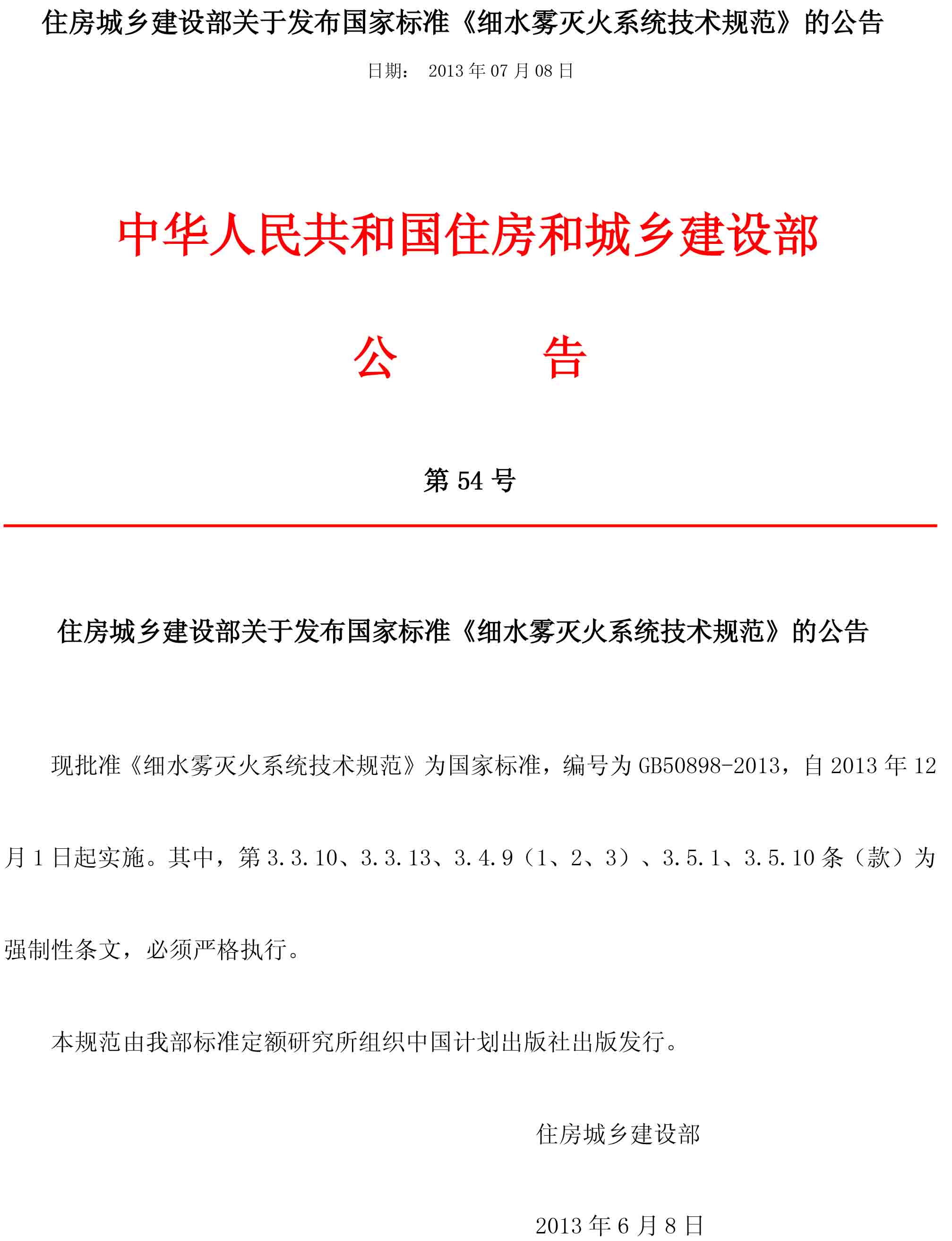 由河南海力特公司参编的《细水雾灭火系统技术规范》国家标准(GB50898-2013)将于2013年12月01日正式颁布实施。本标准为高压细水雾灭火技术的进一步发展提供了有力的政策规范和参考实证。同时,标准的发布也推动了高压细水雾灭火技术在消防灭火领域的全面推广应用,对高压细水雾灭火技术的发展具有划时代的重大意义。
