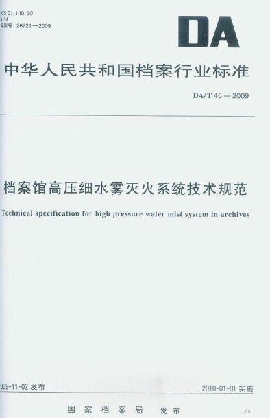 国家行业标准——《档案馆高压细水雾灭火系统技术规范》(DA/T45--2009)由中国国家档案局于2010年1月1日正式发布实施。
