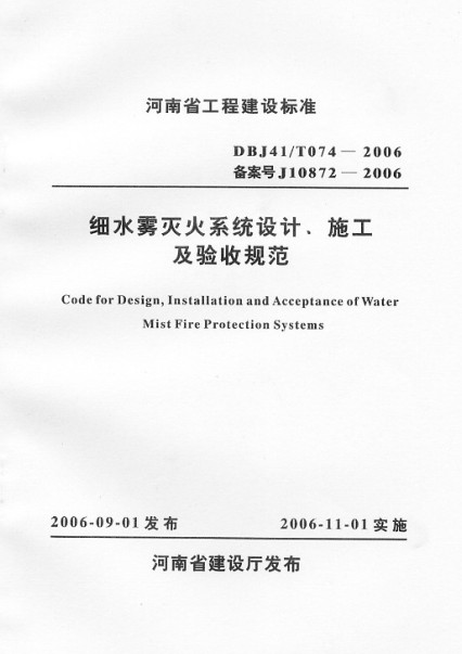 河南省工程建设标准《细水雾灭火系统设计、施工及验收规范》