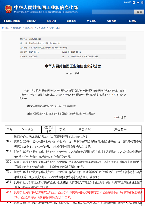 2017年3月1日,国家工信部公布第293批《道路机动车辆生产企业及产品公告》,河南海力特机电制造有限公司列入新增专用汽车生产企业目录,标志着海力特公司将迈入高新技术汽车制造快速发展的新时代!